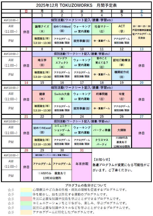 12月は土曜日の開所が1回となっております。いつものペースとは異なりますので、通所されている利用メンバーさんに置かれましては、注意して通所してください!